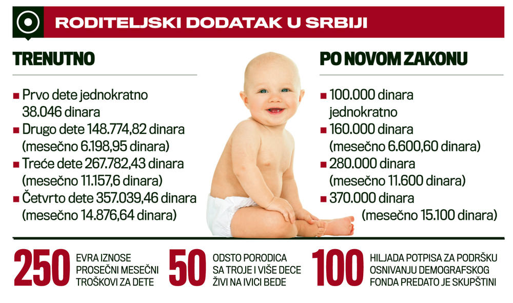 Novi zakon o finansijskoj podršci porodicama sa decom, koji bi trebalo da bude usvojen do kraja godine, propisuje povećanje nadoknade za rođenje prvog, ali i svakog sledećeg deteta.